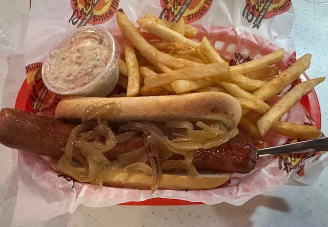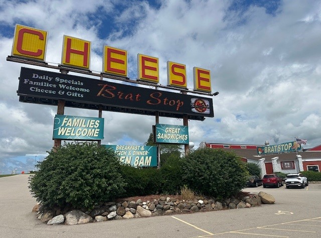 The huge sign, combined with the fact the store is shaped like a castle, definitely gets your attention. We sampled cheeses and ordered lunch from the deli. Less than 10 minutes down the road, also just outside of Kenosha, is The Brat Stop. There is a restaurant and gift shop and their webpage claims that they are, “world famously known for all things brat and cheese related.” Of course we stopped, shopped, and enjoyed a brat!