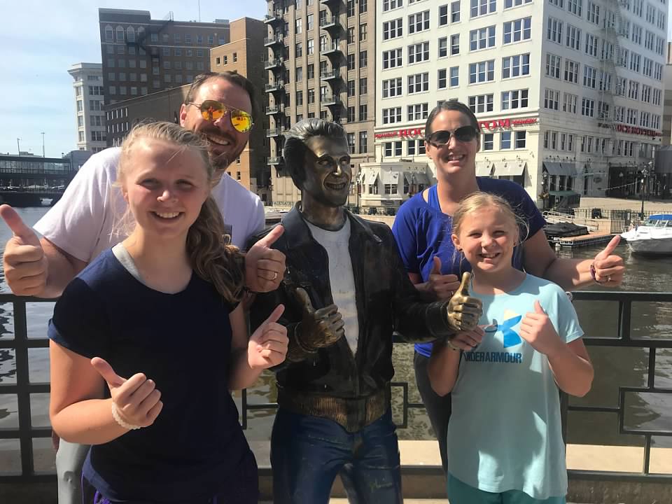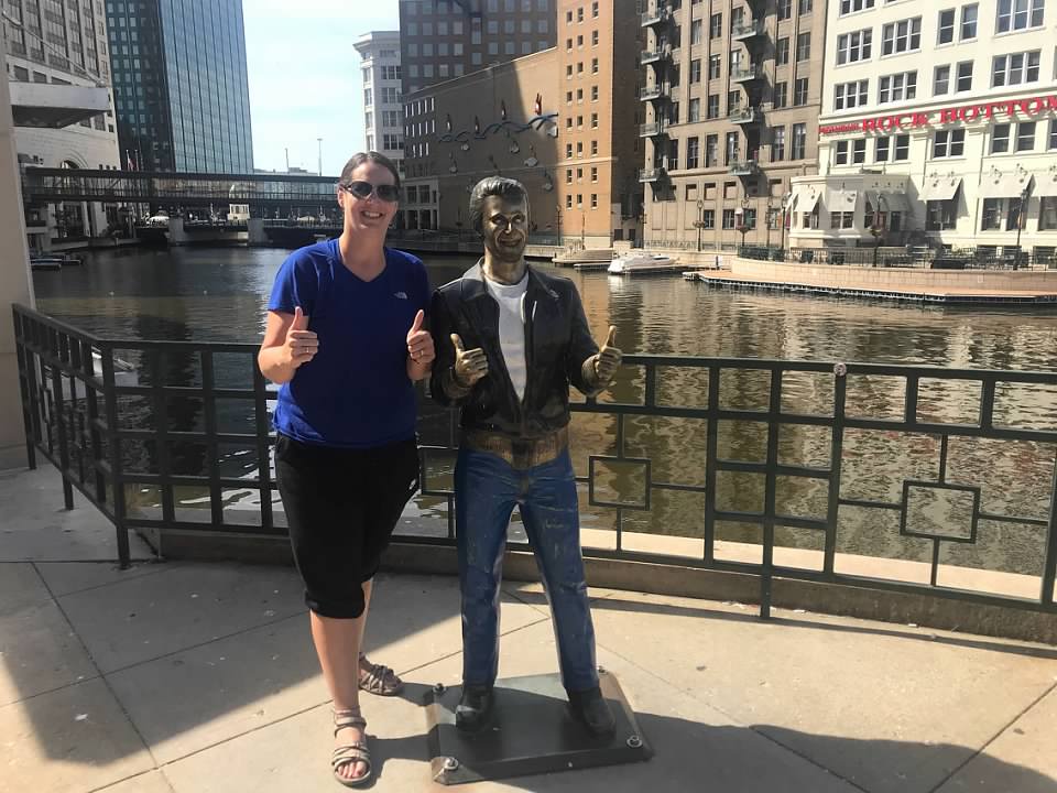 Yet she still opened her home to our crazy road tripping family. We will forever be grateful to Liesel and the countless other friends that have opened their home to us on our adventures. On our couple of days staying in the city we drove through downtown, attended a Brewers game, explored the Riverwalk, and ate dinner out. The Riverwalk was outstanding – I would highly recommend this as your first activity as it really gives you a good look at the city. The path is three miles long and lines both sides of the Milwaukee River. While on the Riverwalk we stumbled upon the Bronz Fonz Statue. This statue of Henry Winkler, the actor that starred as “The Fonz” on the hit TV show Happy Days, was erected in 2008.